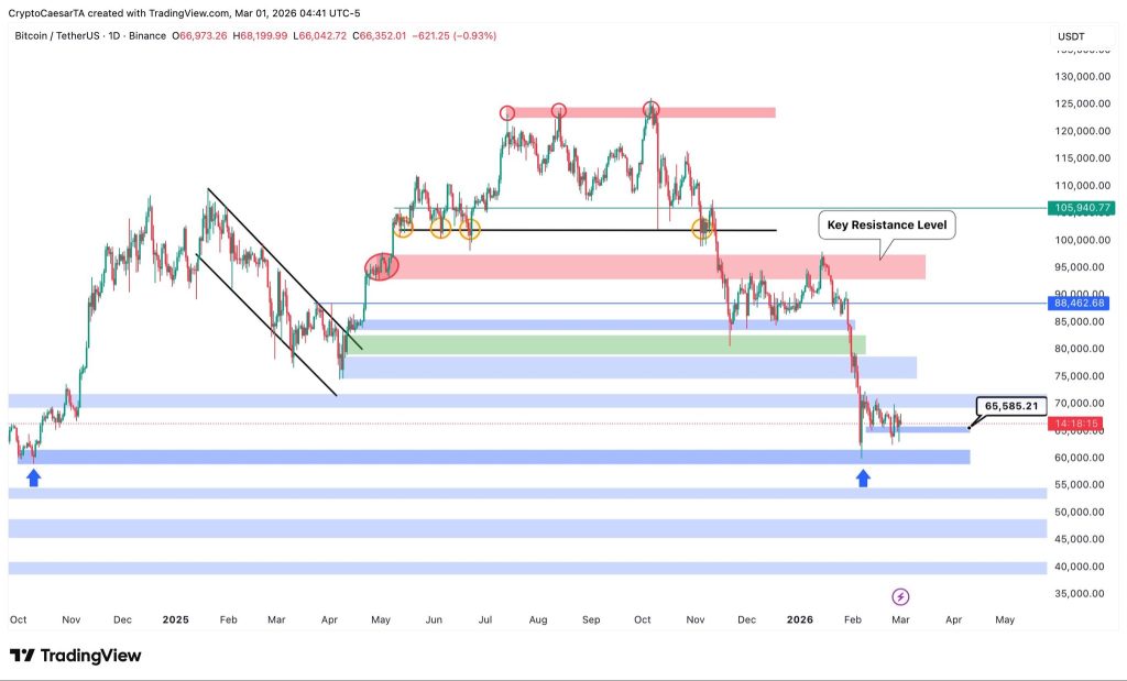 Grafik satu hari BTC/USDT. Sumber: Crypto Caesar/X