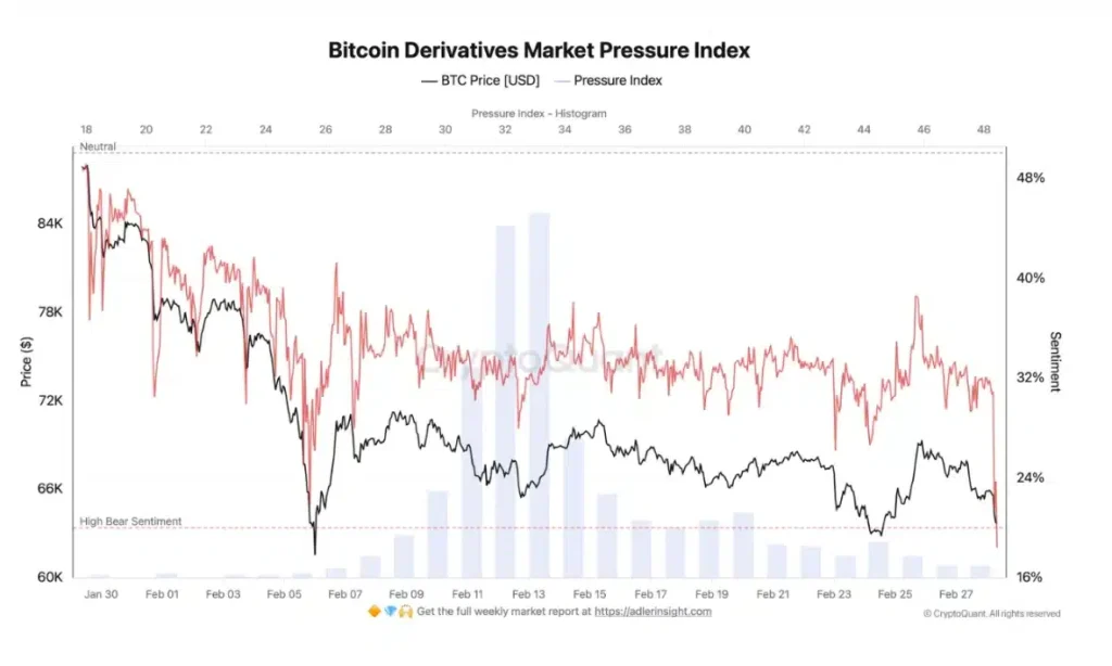 - Leverage Purge: Indeks Tekanan Derivatif Bitcoin anjlok dari 30% ke 18%. Artinya, kepercayaan para bulls hancur seketika dan para trader yang pakai modal pinjaman (leverage) dipaksa keluar lewat reaksi berantai likuidasi.