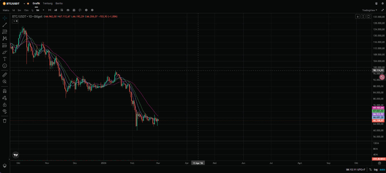 Pagi ini, si “Raja Crypto” alias Bitcoin (BTC) kelihatannya lagi betah banget main di area $65.841. Pergerakannya lagi agak mager alias konsolidasi, nggak terlalu liar tapi tetep bikin was-was kalau kita nggak pasang mata.