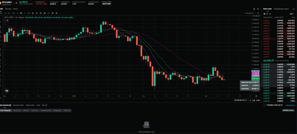 Berdasarkan data terbaru dari chart Bitget pagi ini (07:09 WIB), Bitcoin terpantau masih dalam tren koreksi jangka pendek. Harga sekarang berada di level $66.298,27.