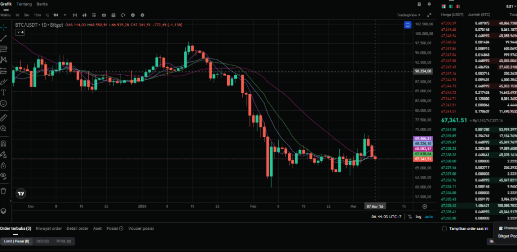 Berdasarkan pantauan langsung dari chart Bitget pagi ini (06:44 WIB), Bitcoin terpantau sedang berada dalam zona merah tipis. Harga sekarang lagi anteng di kisaran $67.341,51.