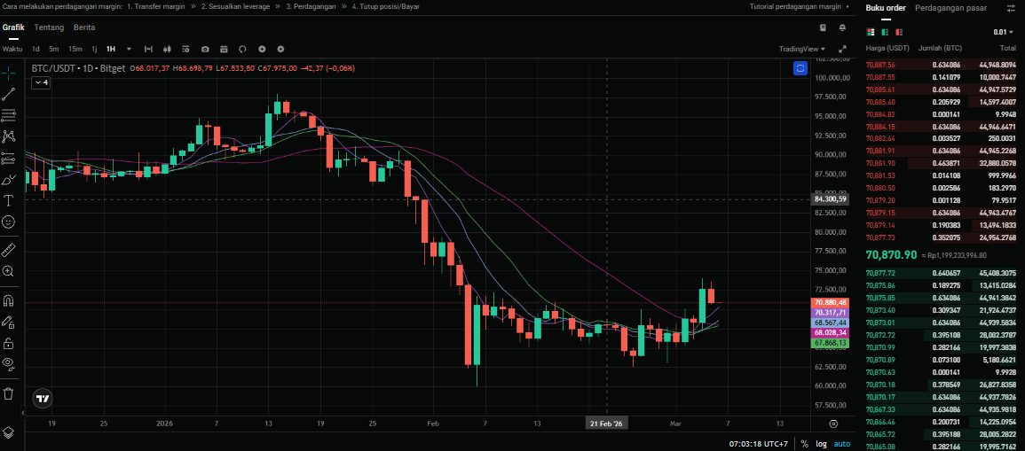 Berdasarkan data dari Bitget per jam 07:03 WIB, Bitcoin sekarang lagi bertengger di kisaran $70.870,90. Ada penurunan tipis dibandingkan harga penutupan kemarin, tapi tenang aja, ini masih jauh di atas harga awal minggu lalu.